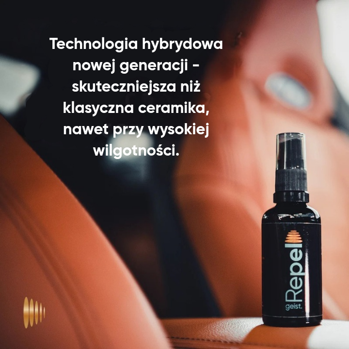 Geist. Repel to nowej generacji powłoka ochronna na bazie hybrydowych polimerów, zaprojektowana specjalnie do ochrony tapicerek skórzanych i syntetycznych.